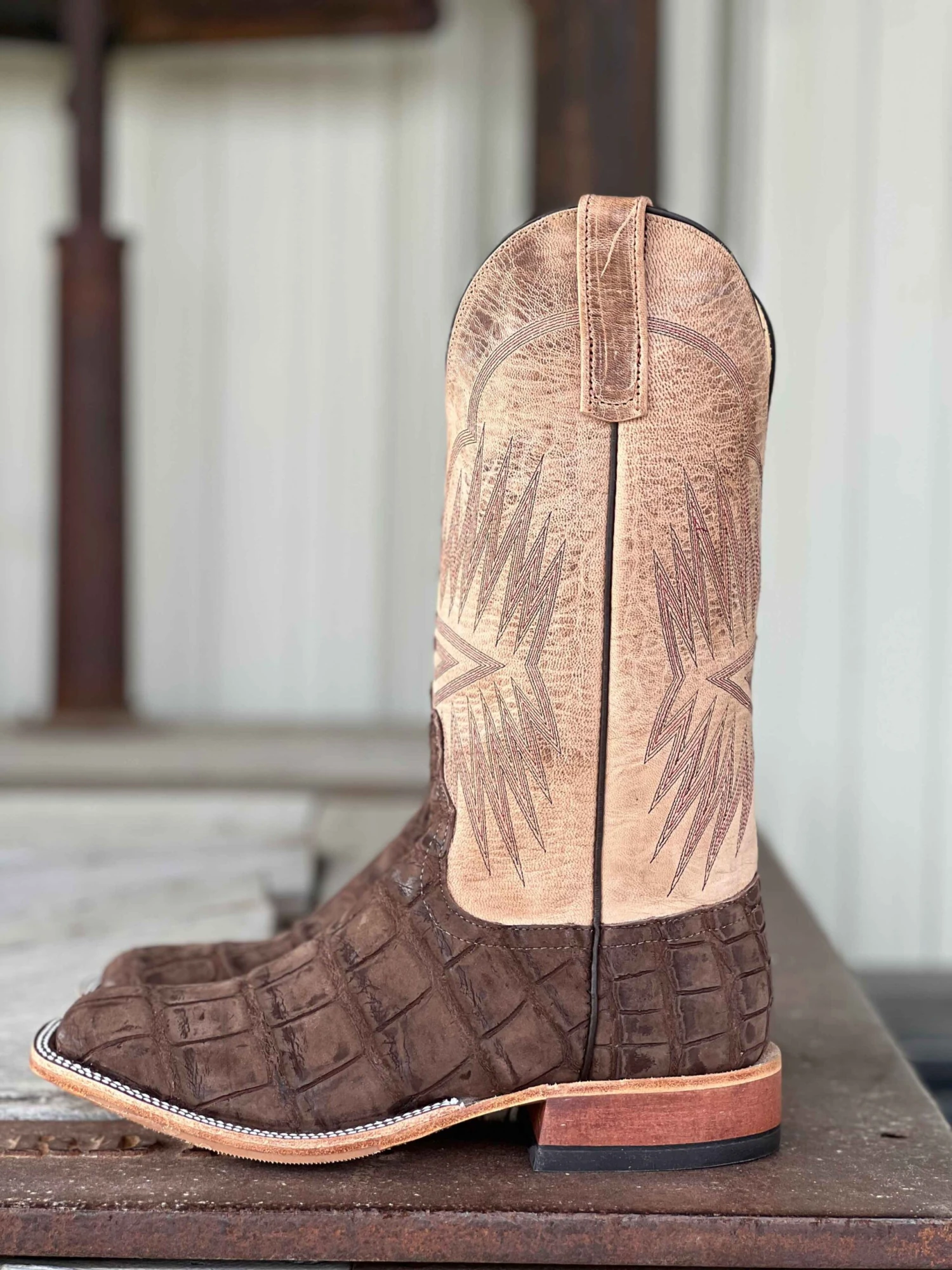 Vamp: Chocolate Nubuck Alligator | Top: Tan Mad Cat | Top Height: 13” | Toe: DB | Sole: Hybrid w/ Cush-N-Sole | Color: Brown/Tan | Proudly made in the USA |