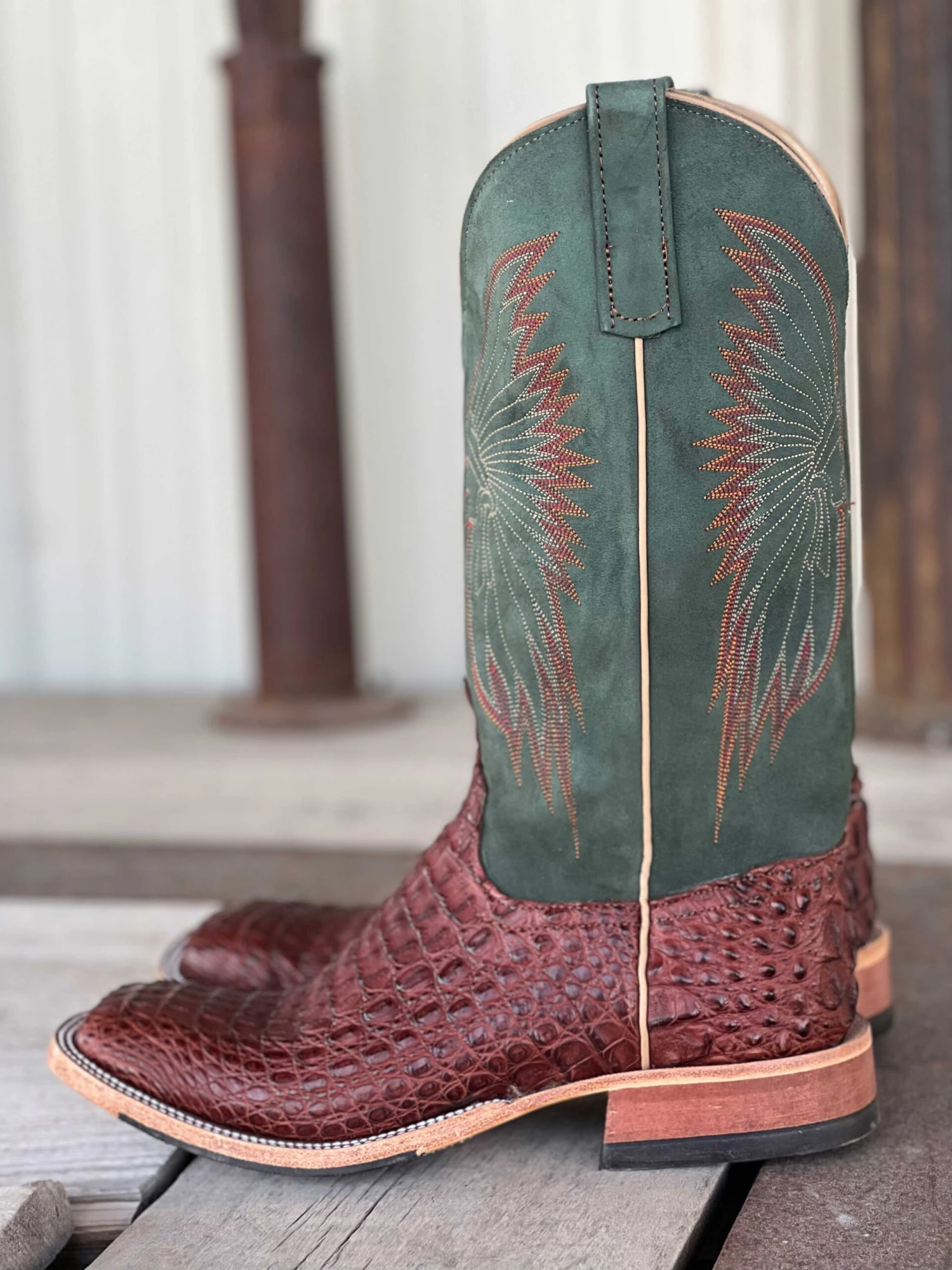 Vamp: Rust Lux Hornback Caiman | Top: Green Velvet Kidskin Reversed | Color: Brown/Green | Top Height: 13″ | Toe: DB | Sole: Hybrid w/ Cush-N-Sole | Proudly made in the USA |