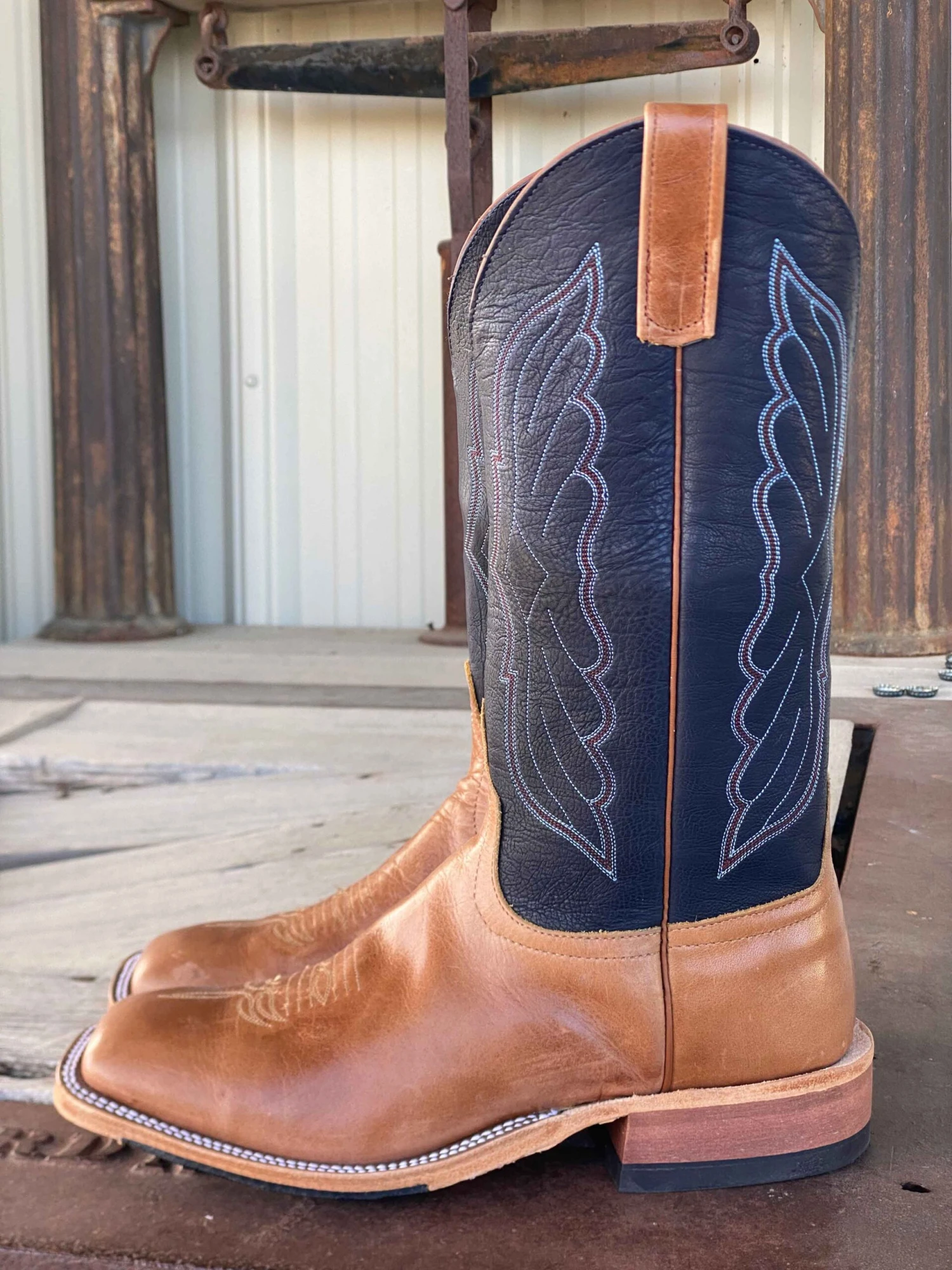 Vamp:Â Sunflower Galega | Top: Navy Denver Calf | Color: Tan/Navy | Top Height: 13″ | Toe:Â DBÂ | Heel:Â AB | Sole:Â Hybrid Midsole and Cush-N-Sole | Proudly made in the USAÂ