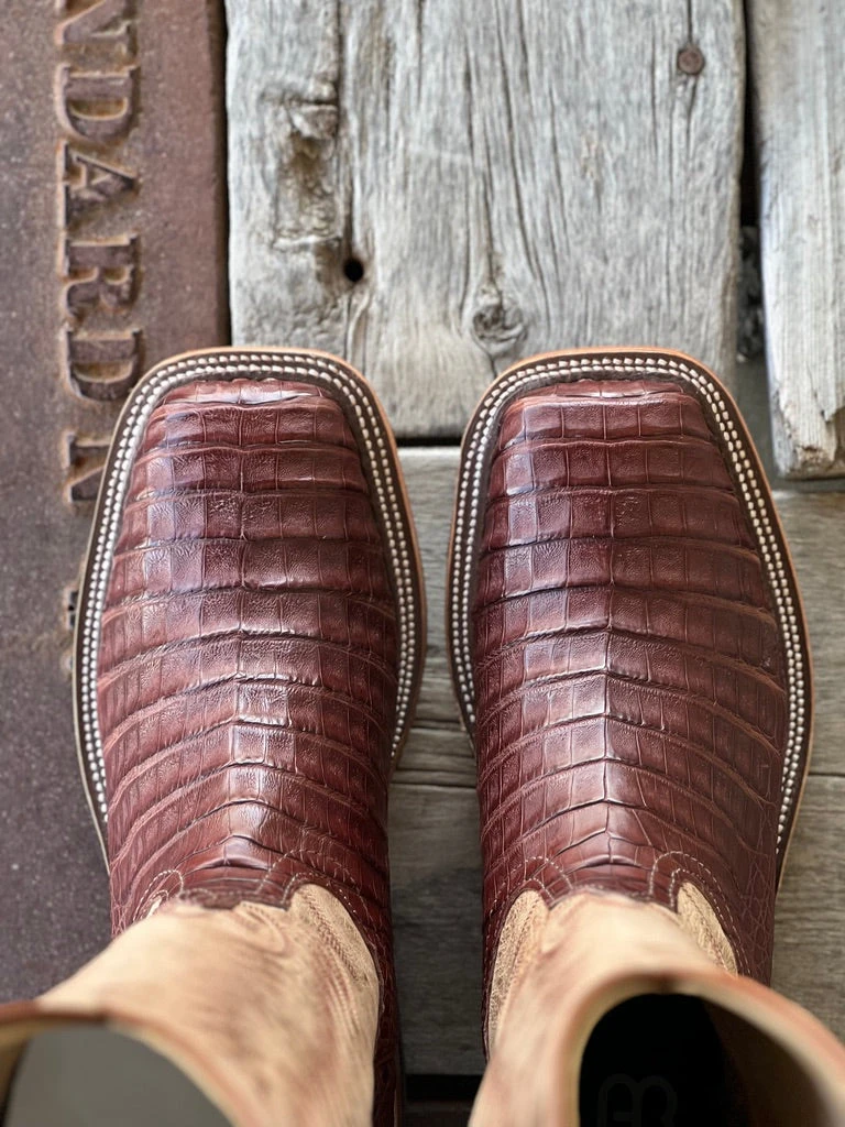 Vamp: Tobacco Caiman Belly | Top: Ivory Mad Dog | Top Height: 13” | Toe: DB | Sole: Hybrid w/ Cush-N-Sole | Color: Brown/Ivory | Proudly made in the USA |