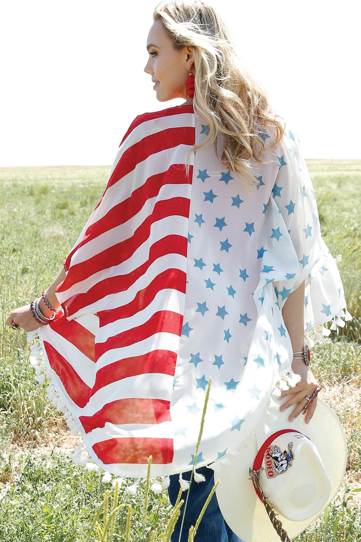 3/4 Sleeve | Stars/Stripes Printed Chiffon Kimono | Tassle Trim