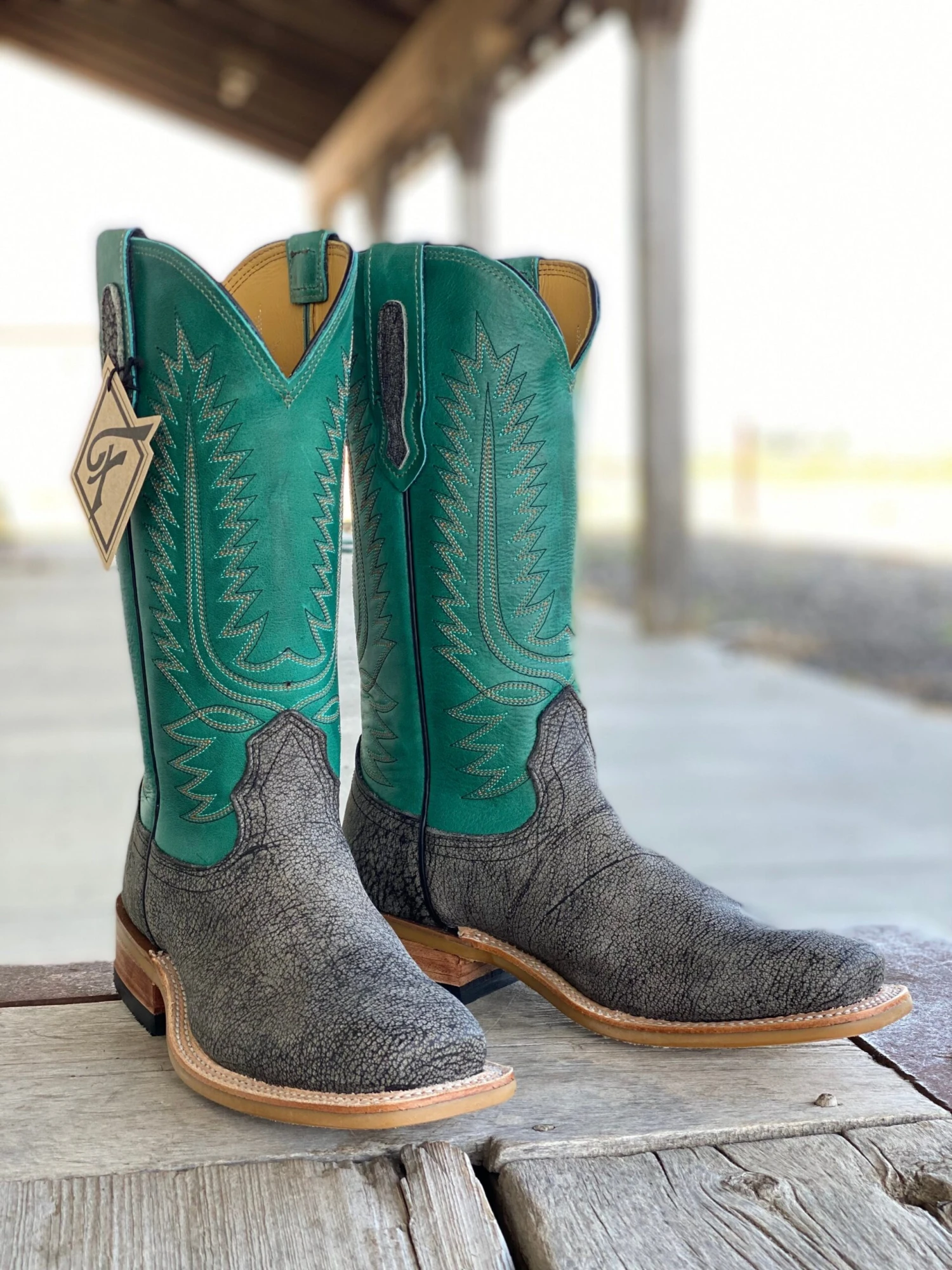 Vamp: Grey Cape Buffalo | Top: Turquoise Eagle | Color: Grey/Turquoise | Top Height: 12″ | Toe: #5 | Sole: Gum Rubber | Proudly made in the USA |