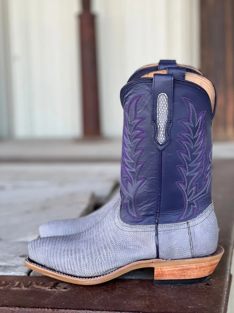 Vamp: Grey Vintage Lizard | Top: Purple S Series | Color: Grey/Purple | Top Height: 11” | Toe: #1 | Heel: C Long | Sole: Tan Ranch Tough | Proudly made in the USA |