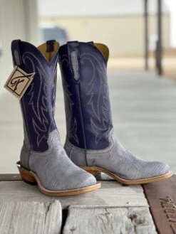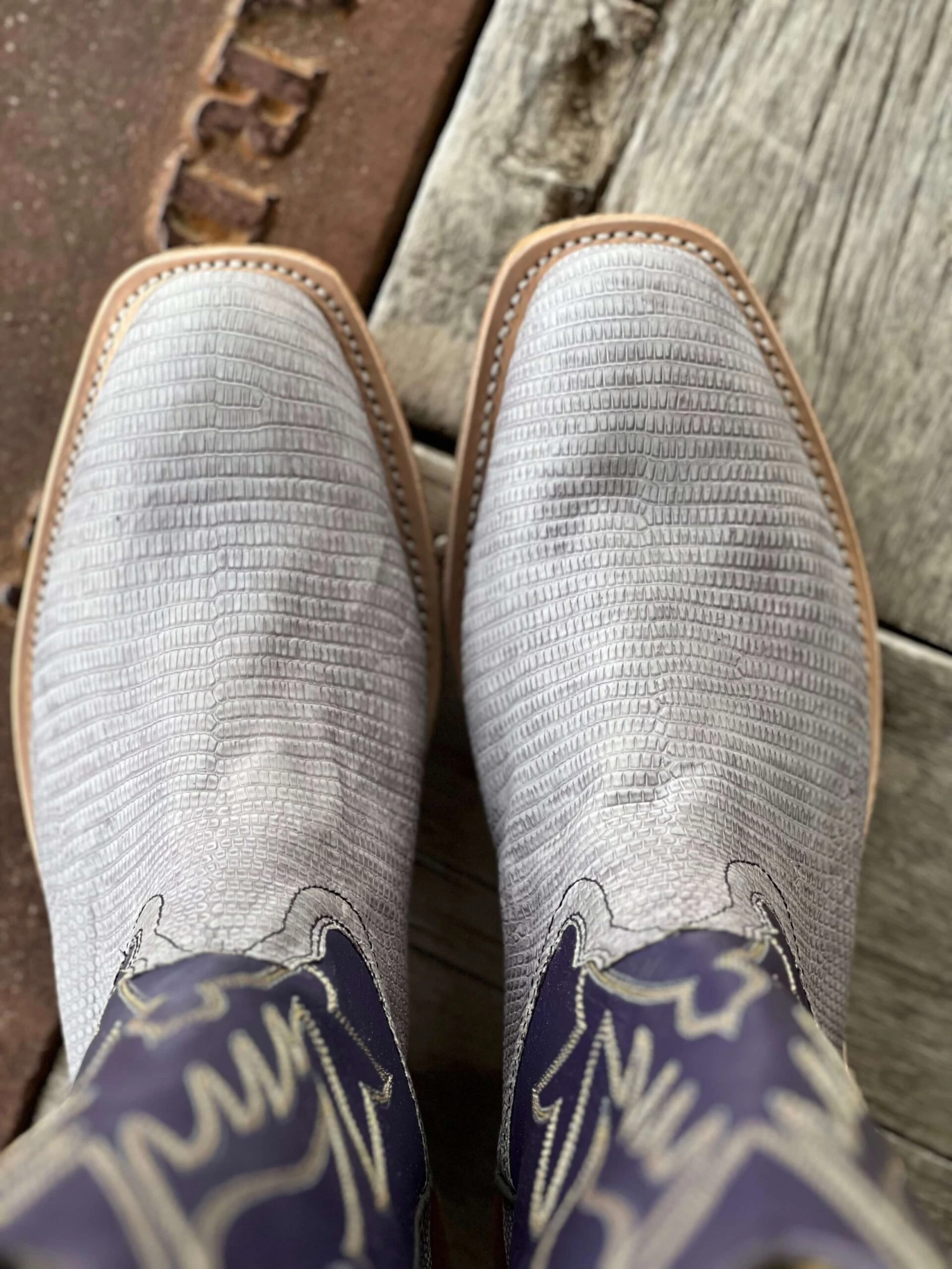 Vamp: Grey Vintage Lizard | Top: Purple S Series | Color: Grey/Purple | Top Height: 13” | Toe: #1 | Heel: C Long | Sole: Tan Ranch Tough | Proudly made in the USA |