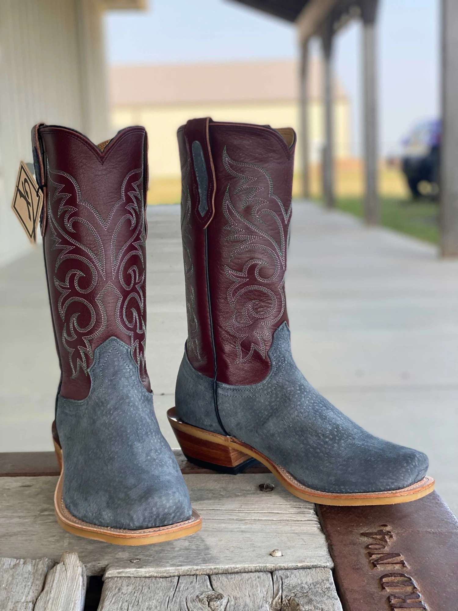 Vamp: Grey Carpincho | Top: Burgundy Whole Hide | Color: Grey/Burgundy | Top Height: 12″ | Toe: #0 | Heel: C Long | Sole: Ranch Ready | Proudly made in the USA