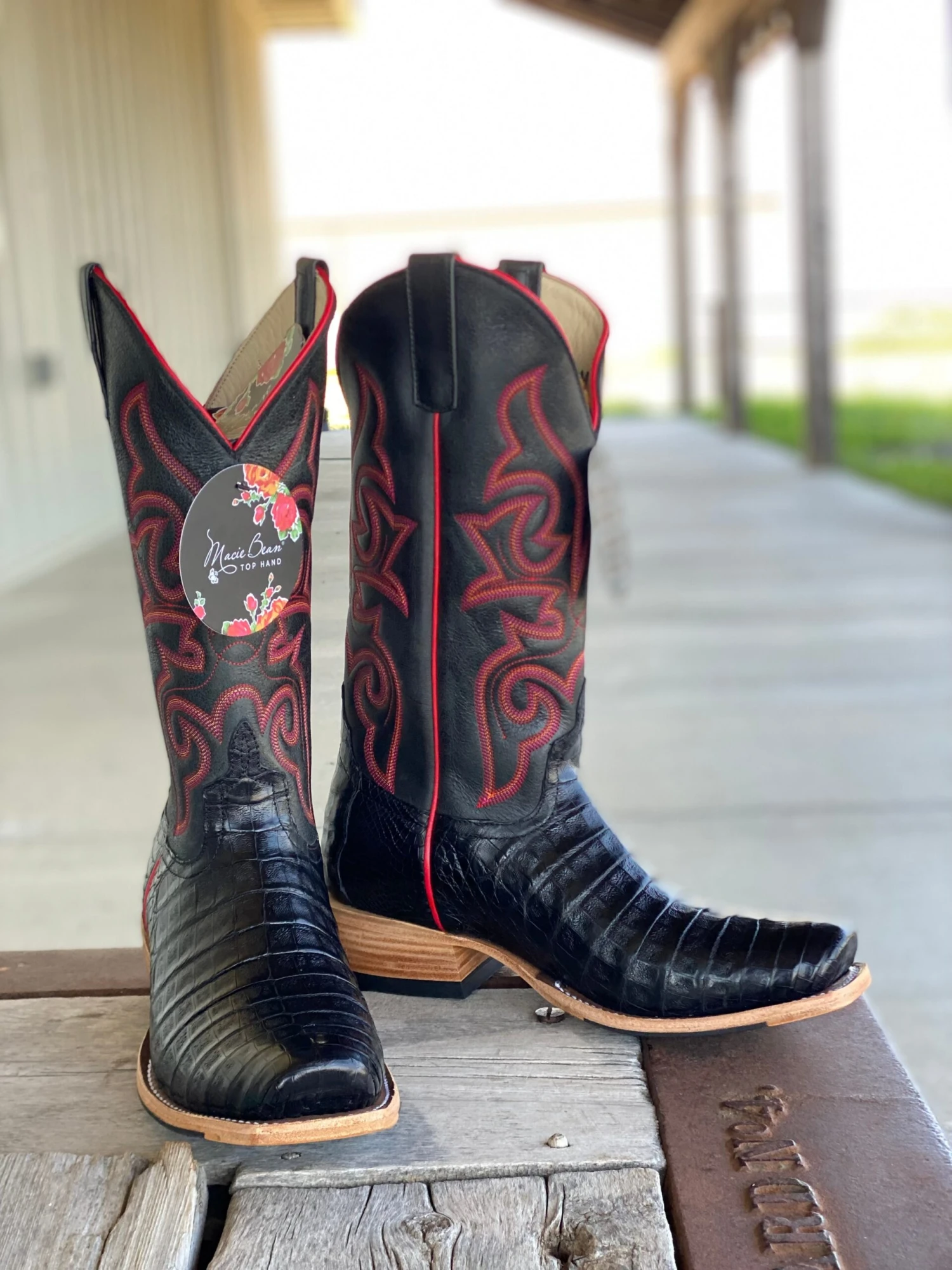 Vamp: Black Caiman Belly | Top: Black Pull Up | Color: Black | Top Height: 13″ | Toe:Â TK | Heel: Cowgirl | Sole:Â Black Hybrid