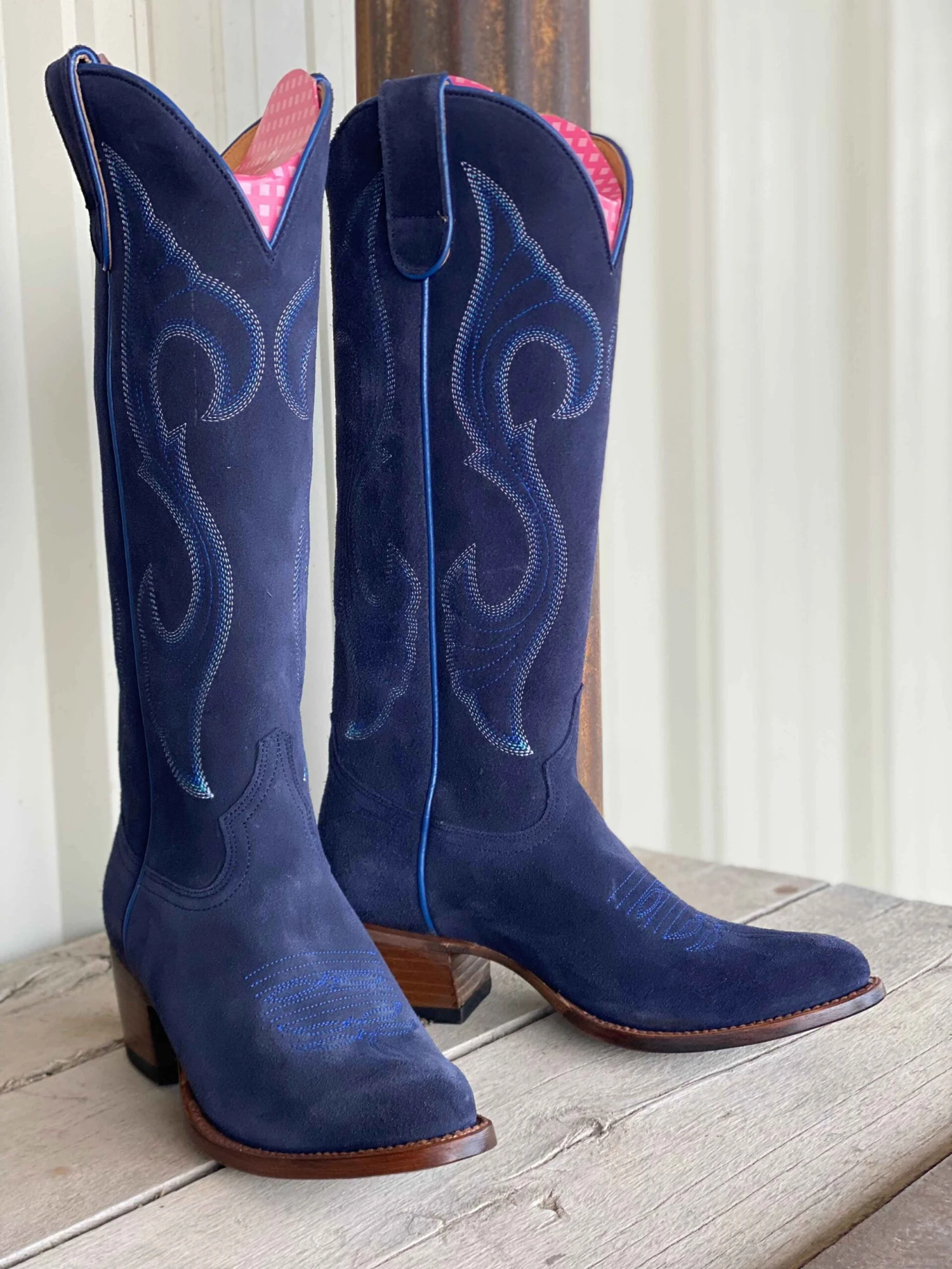 Vamp: Marine Blue Suede | Top: Marine Blue Suede | Color: Blue | Top Height: 15″ | Toe:Â ROÂ | Heel: Citygirl | Sole: LeatherÂ