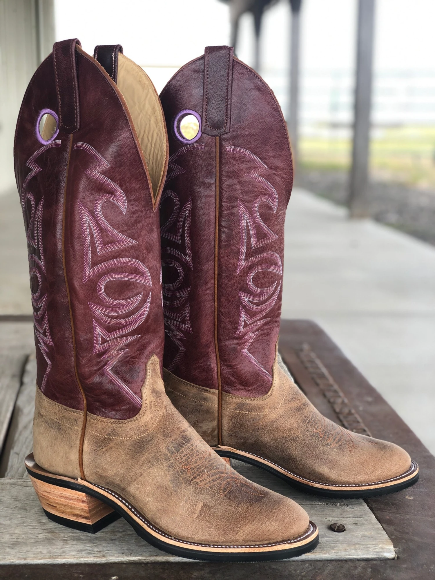 Vamp: Angry Elk | Top: Burgundy Explosion | Color: Tan/Burgundy | Top Height: 16″ | Toe: U | Heel: 5 | Sole: Fineline w/ Neoprene Midsole w/ Cush-N-Sole | Proudly made in the USA |