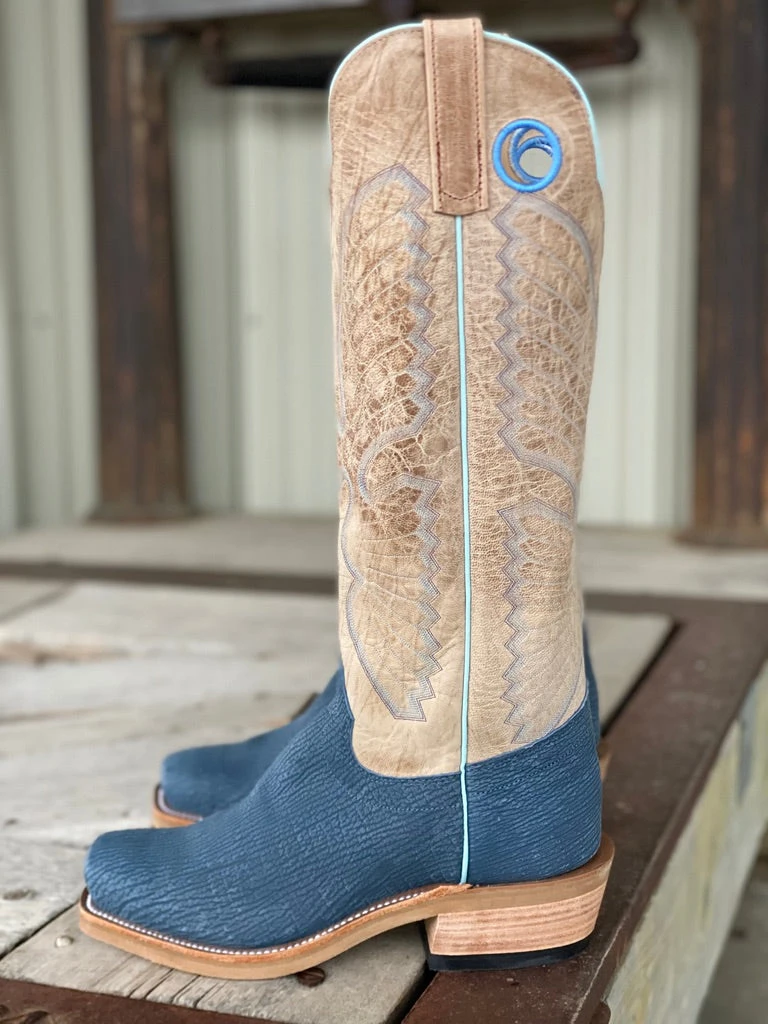 Vamp: Blue Safari Shark | Top: Ivory Mad Dog | Color: Blue/Ivory | Top Height: 16″ | Toe: Cutter | Heel: 1 1/2″L | Sole: Oxbow w/ Neoprene Midsole and Cush-N-Sole | Proudly made in the USAÂ