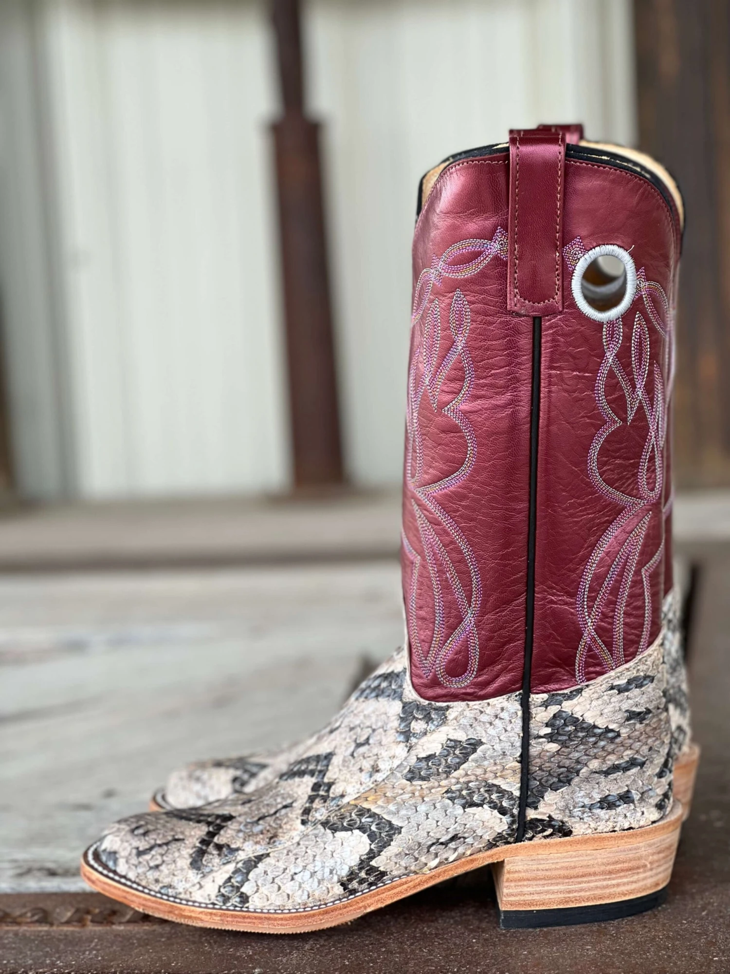 Vamp: Canebrake Rattlesnake | Top: Sangria Lustre Kidskin | Color: Grey/Burgundy | Top Height: 13″ | Toe:Â J | Heel:Â 1 1/2 LÂ | Sole: Tan Hybrid | Proudly made in the USA