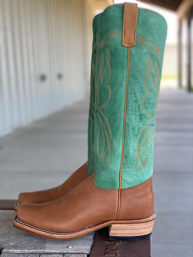 Vamp: Coffee Milled Mule | Top: Green Super Oil | Color: Tan/Green | Top Height: 16″ | Toe: 0 | Heel: 1 1/2″L | Sole: Tan Fineline w/ Cush-N-Sole | Proudly made in the USA |