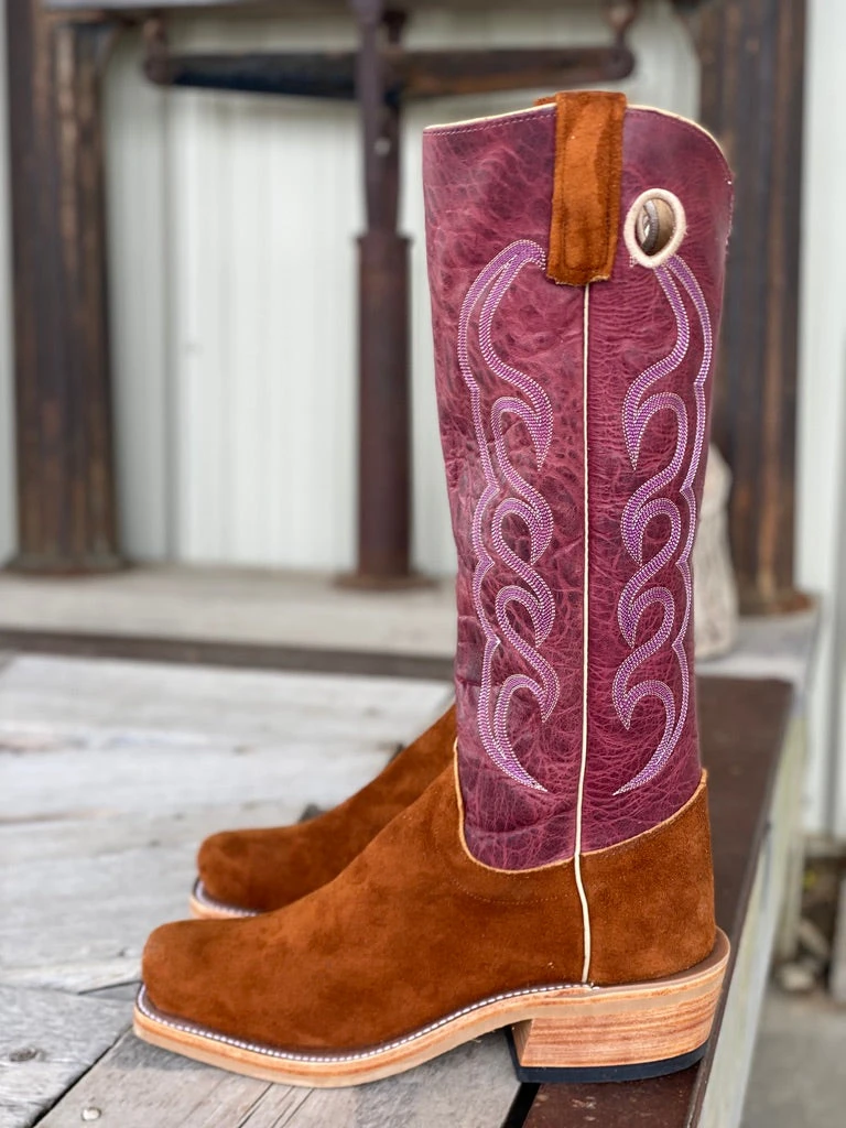 Ladies boot:Â Vamp:Â Tan Elk Roughout | Top:Â Deep Violet Bison | Color: Rust/Burgundy | Top Height: 16″ | Toe:Â Cutter | Heel: 1 1/2″L | Sole:Â Oxbow w/ Neoprene Midsole and Cush-N-Sole | Proudly made in the USA |